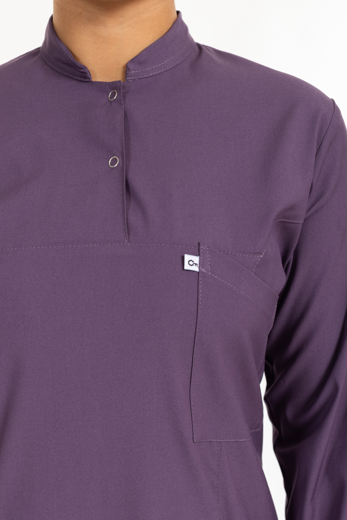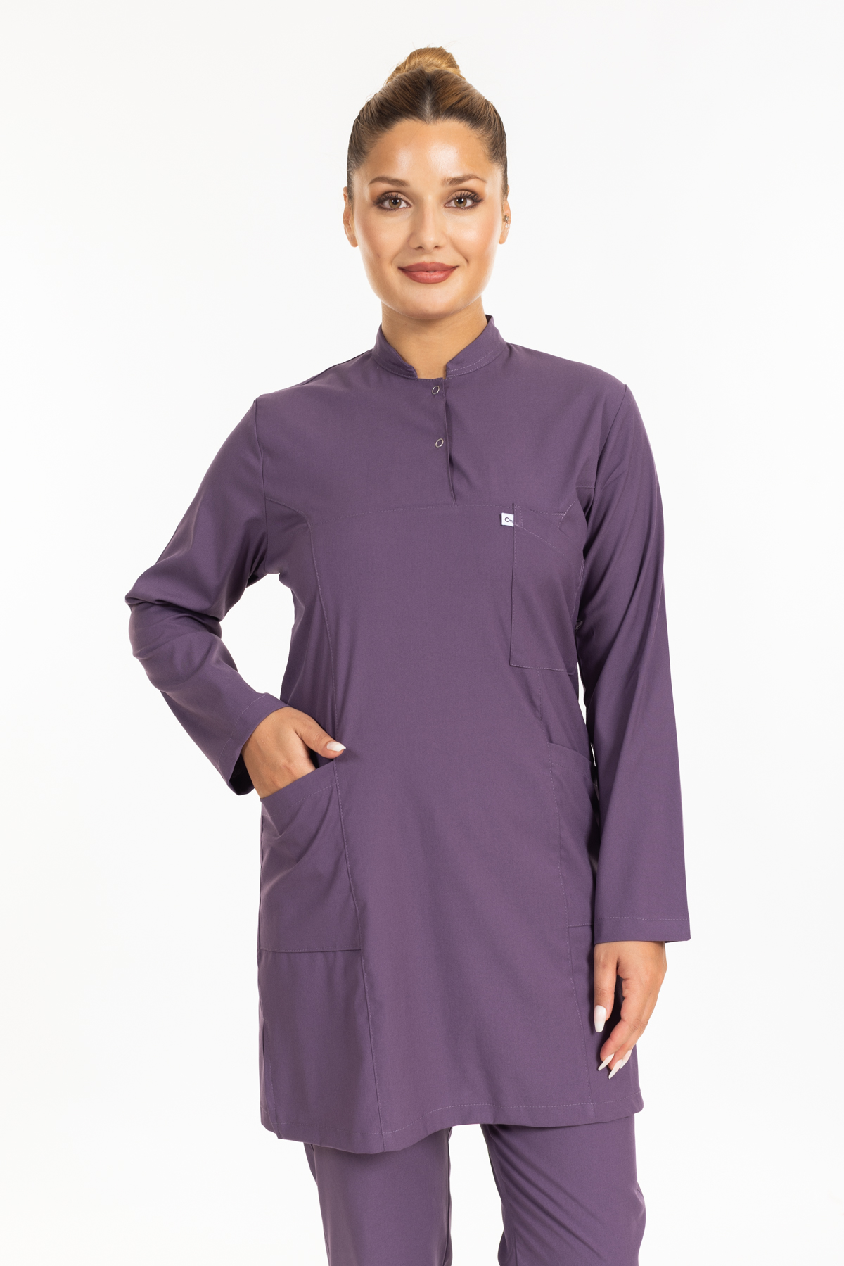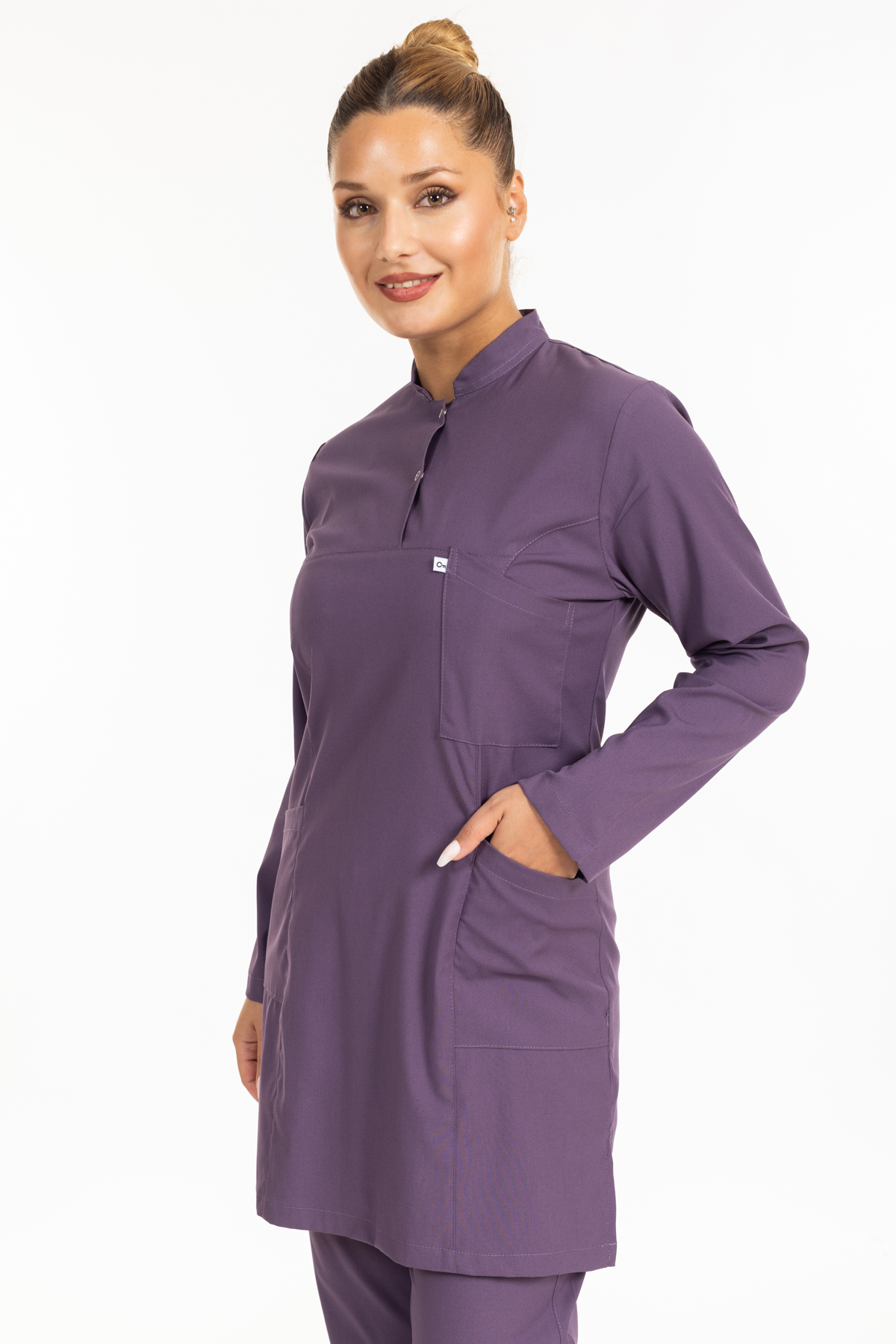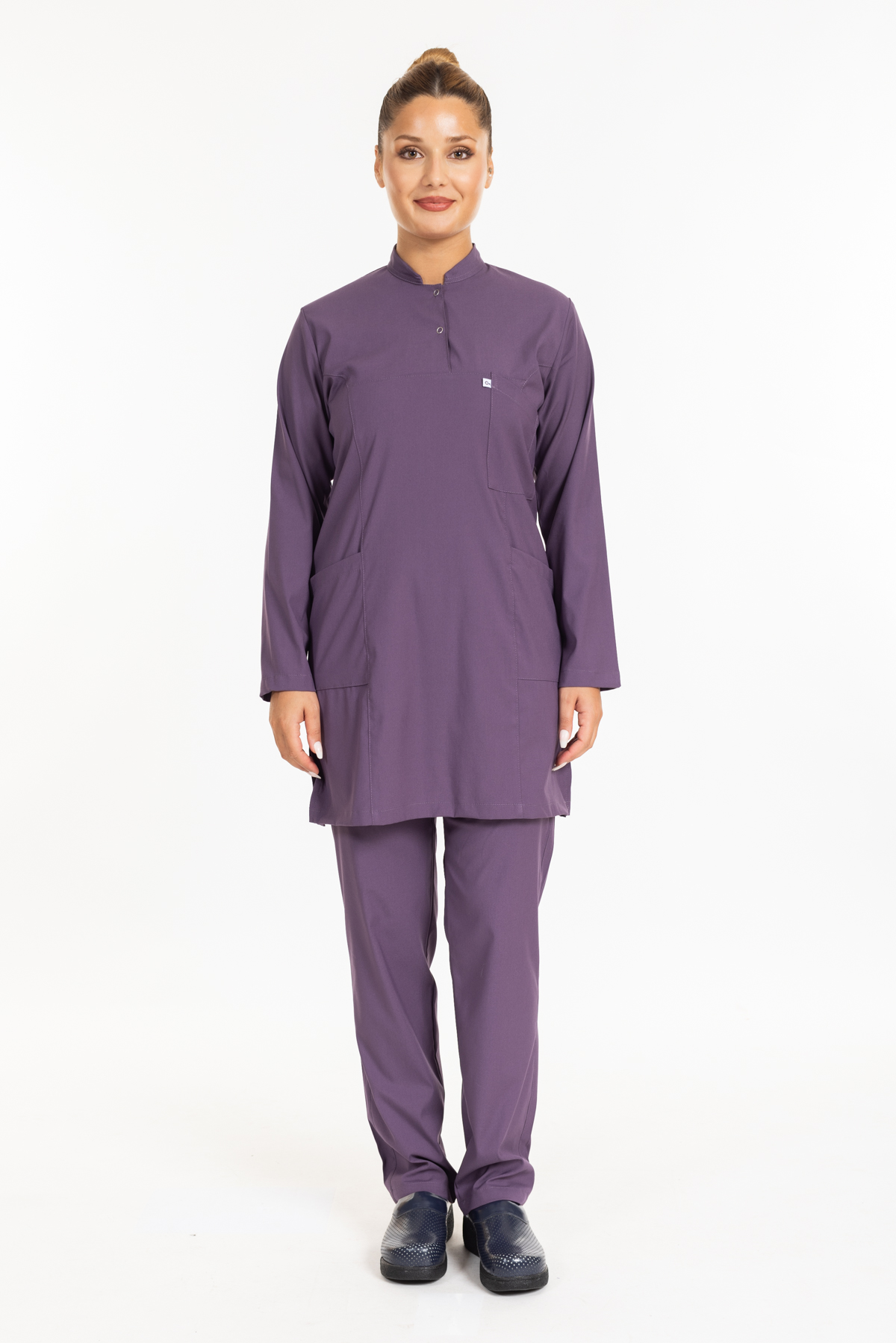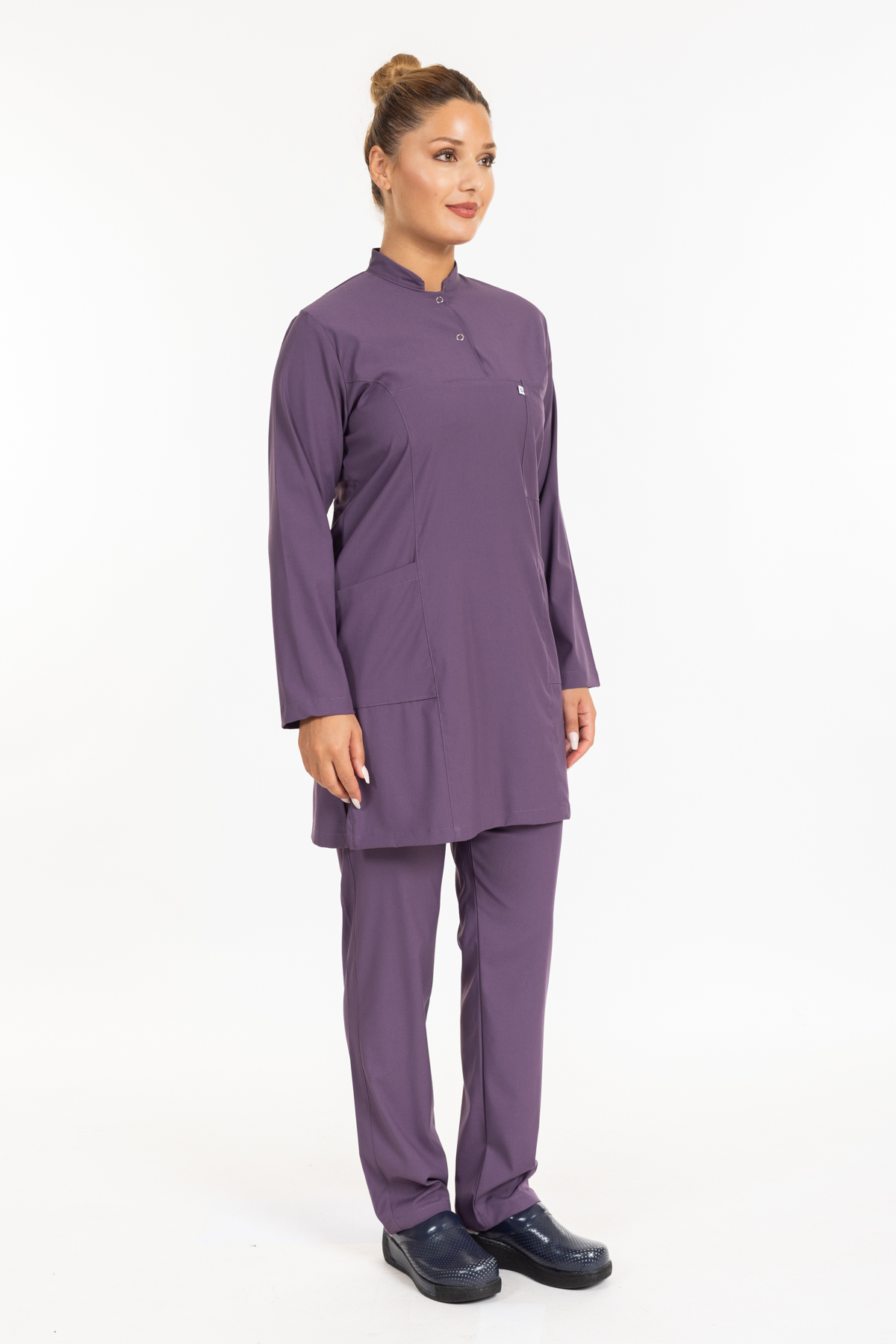 - Özel Mor Likralı Tesettür Takım Premium Hakim Yaka (Çıtçıtlı) rahatlık ve şıklık anlamına sahip olan hakim yaka modeli ameliyathane, acil servis, yoğun bakımlar ve bazı yataklı servislerde nöbet forması olarak tercih edilmektedir.